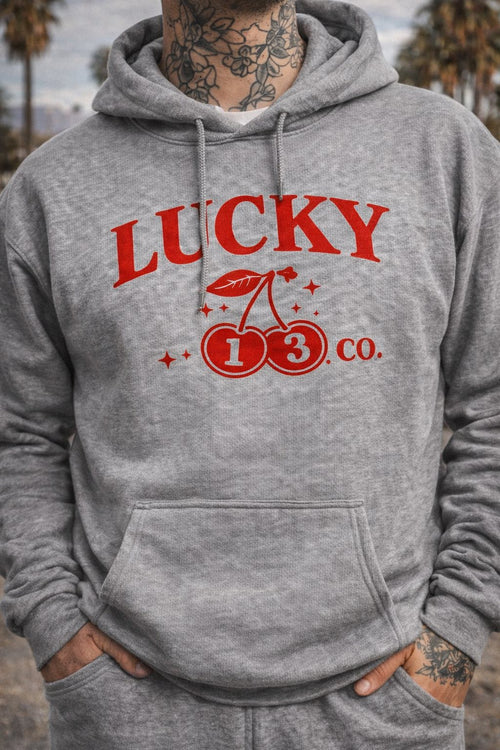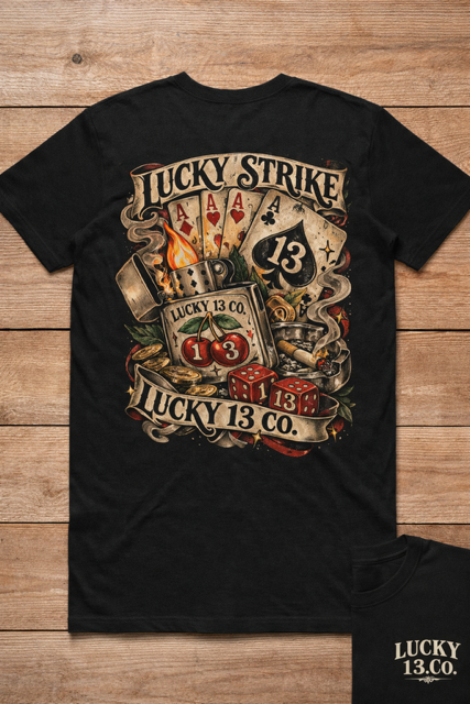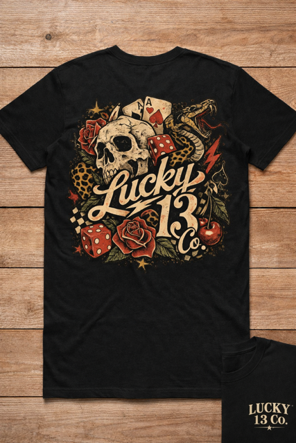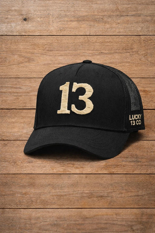 Five Panel Twill Cap, Natural/Black, Embroidered in RED with the upside down LUCKY and 13 co.